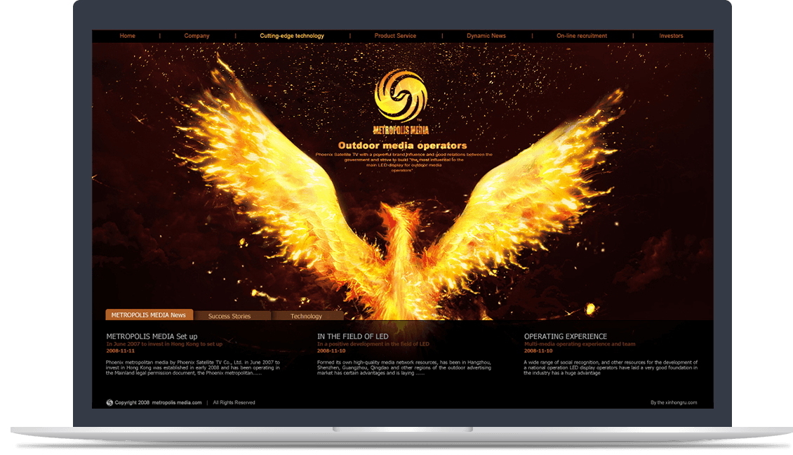 官網(wǎng)以鳳凰傳媒的標(biāo)志性圖標(biāo)和鳳凰圖案作為創(chuàng)意靈感,通過熾熱的火鳳凰表現(xiàn)鳳凰都市傳媒澎湃的新聞熱情和敢于承擔(dān)的社會責(zé)任。頁面視覺感官效果和鳳凰都市傳媒品牌調(diào)性高度吻合,成為鳳凰都市傳媒在互聯(lián)網(wǎng)領(lǐng)域閃亮的名片。