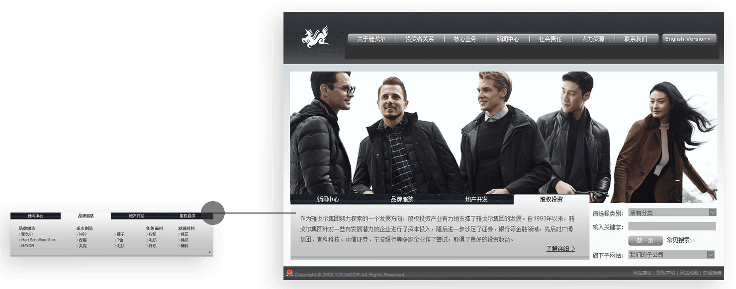 新鴻儒結(jié)合雅戈?duì)柤瘓F(tuán)的整體視覺(jué)規(guī)范,為雅戈?duì)柦ㄔO(shè)了集團(tuán)官網(wǎng)及系列旗下品牌網(wǎng)站。不僅在設(shè)計(jì)上體現(xiàn)雅戈?duì)柶放?br>的尊貴與穩(wěn)重的內(nèi)涵。同時(shí),技術(shù)上為其規(guī)劃了集團(tuán)網(wǎng)站群管理體系。