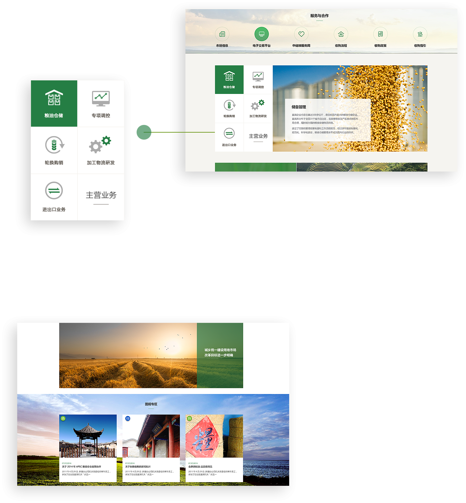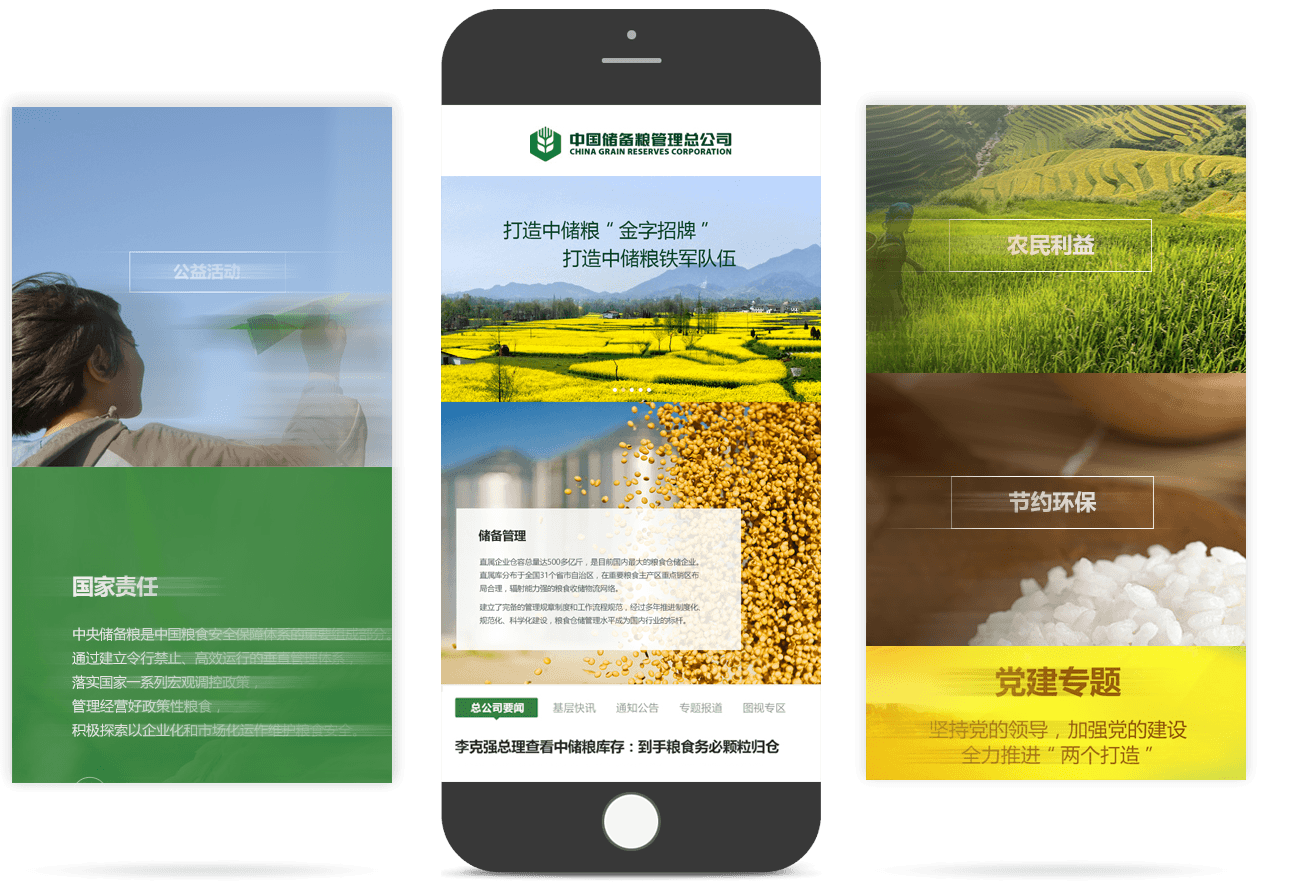 中儲(chǔ)糧官網(wǎng)采用扁平化ICON的方式,集中展示儲(chǔ)備管理、輪換購(gòu)銷(xiāo)、專(zhuān)項(xiàng)調(diào)控等多元業(yè)務(wù),在保證用戶便于閱讀的基礎(chǔ)上,通過(guò)創(chuàng)意、交互吸引用戶關(guān)注。