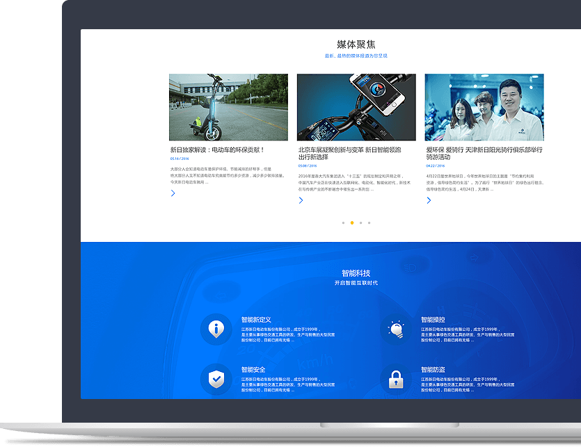 新日電動(dòng)車官網(wǎng)以品牌為核心,以產(chǎn)品為基礎(chǔ),通過(guò)JS/CSS3交互技術(shù)、全屏視頻等方式, 塑造企業(yè)創(chuàng)新、智能的品牌形象。