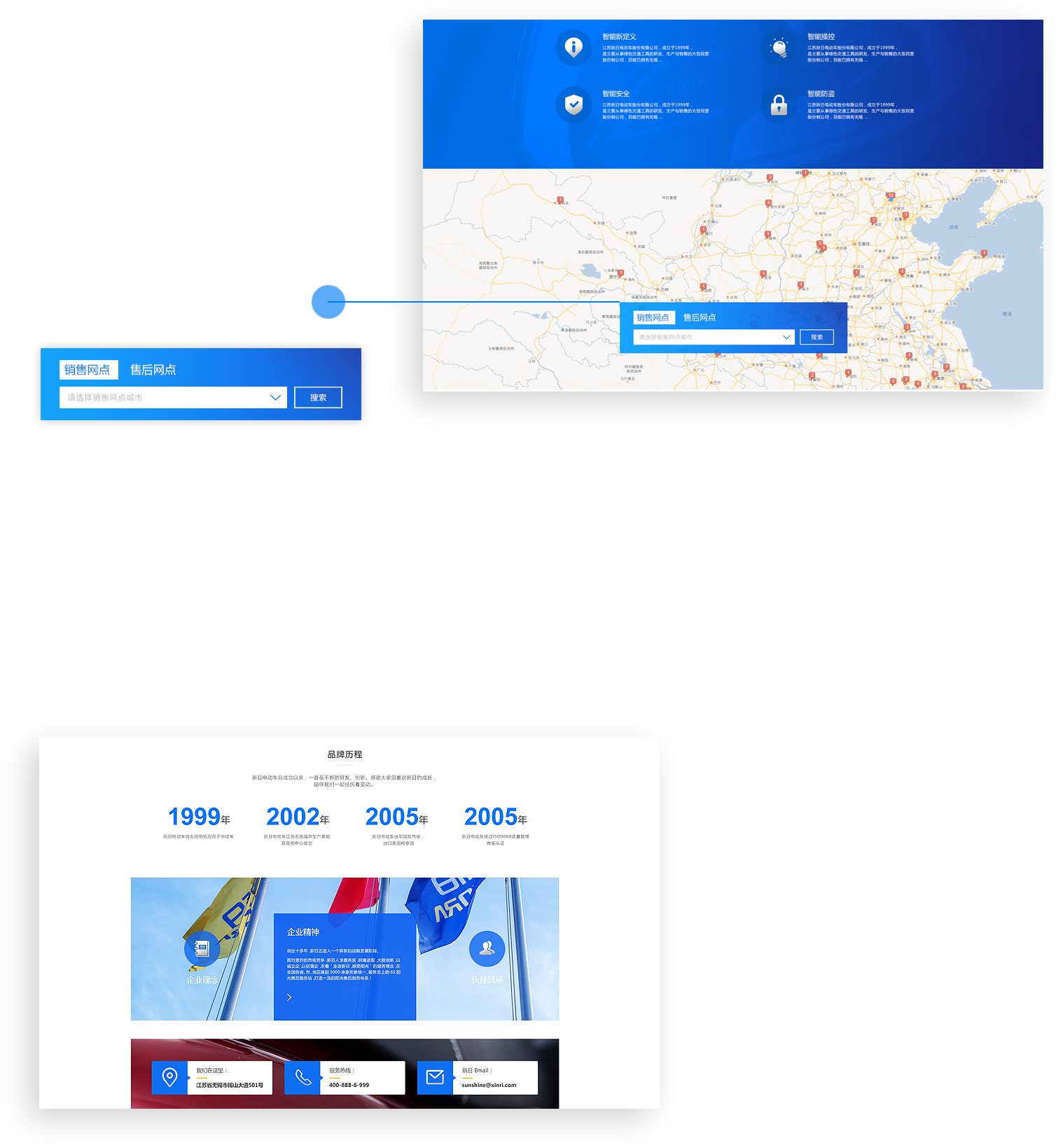 新日電動(dòng)車官網(wǎng)調(diào)取百度地圖實(shí)時(shí)數(shù)據(jù),通過(guò)標(biāo)簽定位的方式,實(shí)現(xiàn)銷售網(wǎng)點(diǎn)、售后網(wǎng)點(diǎn)的查詢,極大的方便了用戶,提升了服務(wù)質(zhì)量和銷售渠道。