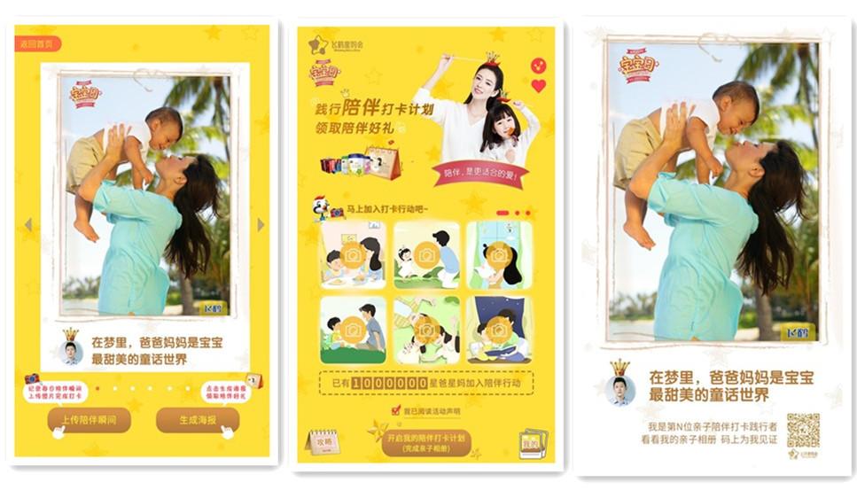 今年是飛鶴倡議“5.28中國寶寶日”的第二年,飛鶴從陪伴號召升級為陪伴指引,打造更適合的陪伴范本。通過H5互動,線上+線下有機聯(lián)動,發(fā)起了全民陪伴行動:線上陪伴習(xí)慣養(yǎng)成打卡。引導(dǎo)寶爸寶媽每天上傳自己陪伴寶寶的瞬間,即刻生成專屬海報,不僅可以在社交網(wǎng)絡(luò)進行分享、曬親子照,還可參加抽獎、邀請好友助力。 7天一個循環(huán),21天養(yǎng)成陪伴寶寶的好習(xí)慣。