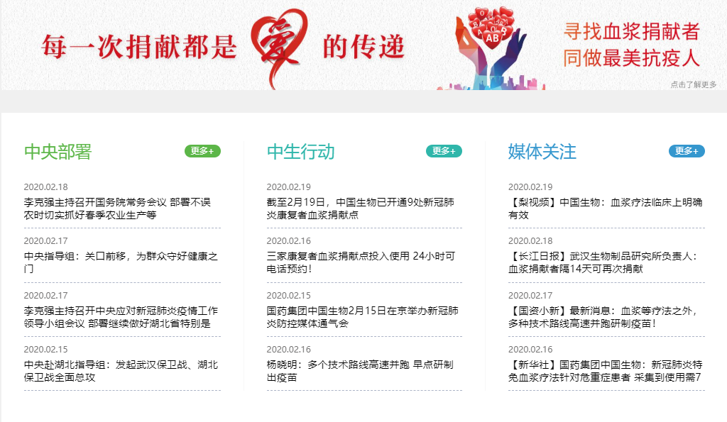 新鴻儒為中國生物所制作的專題欄目,首先,響應國家中央部署,承擔央企使命,第一時間更新中央下達意見;第二,在中國生物的研究下,捐獻血漿成為重中之重,號召與查詢?nèi)肟谛桴r明可見;第三,防疫知識,是大眾最關(guān)心的部分,足夠?qū)I(yè)貼心的防疫知識,可穩(wěn)定人心;最后,群眾關(guān)注、媒體關(guān)注的進程動態(tài)實時更新。