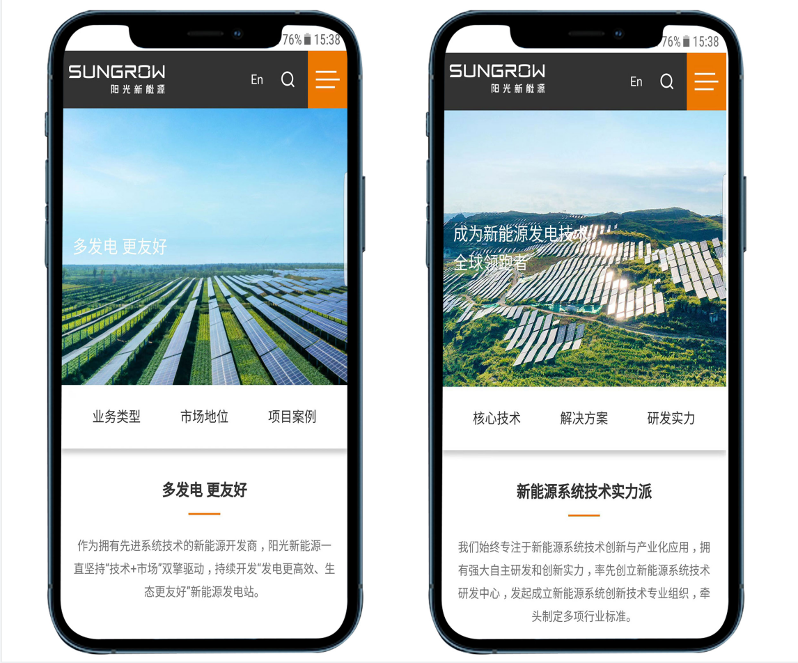 另外,新鴻儒根據(jù)陽光新能源的業(yè)務(wù)需求,對欄目進(jìn)行了精心設(shè)置,以“核心業(yè)務(wù)、技術(shù)創(chuàng)新、可持續(xù)發(fā)展、服務(wù)支持”為重點欄目,多形式呈現(xiàn)、多終端適配,符合訪問者的閱讀瀏覽習(xí)慣,更利于獲取企業(yè)信息。