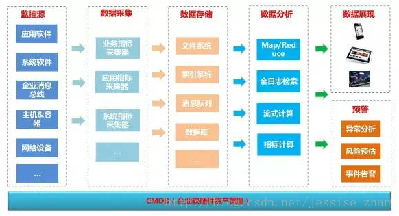 統(tǒng)一監(jiān)控平臺(tái)由七大角色構(gòu)成:監(jiān)控源、數(shù)據(jù)采集、數(shù)據(jù)存儲(chǔ)、數(shù)據(jù)分析、數(shù)據(jù)展現(xiàn)、預(yù)警中心、CMDB(企業(yè)軟硬件資產(chǎn)管理)。